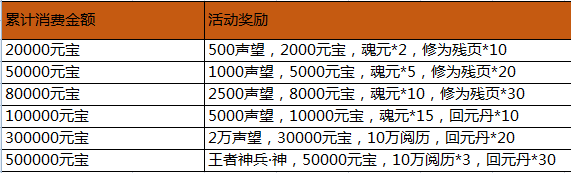 活动内容:活动期间,游戏内充值活动,玩家单笔充值一定金额,即可获得相应的充值奖励。(单笔充值奖励只计算充值元宝最大值,可以单笔重复充值重复领取)