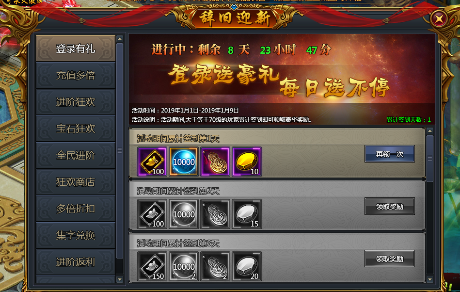 登录有礼:活动期间,等级大于等于70级的玩家累计签到一定次数即可领取对应奖励,当日充值任意金额即可再领一次。