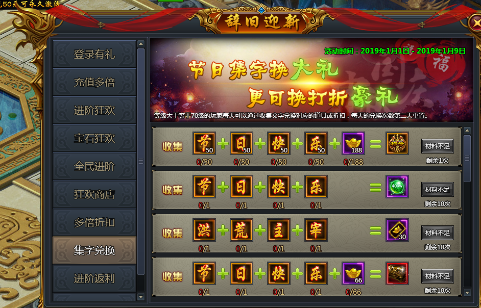 (四)集字兑换(开服时间大于等于第四天开启)