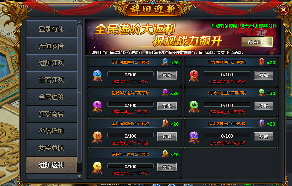 活动期间每消耗一定数量的进阶材料进阶即可获得大量的材料返利。