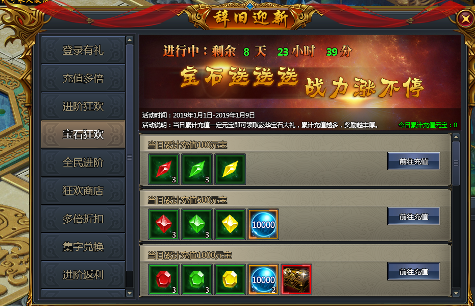 活动期间,每充值一定元宝的玩家都可以获得超值的宝石大礼包,各种高阶宝石、海量修为、特戒宝箱送不停。