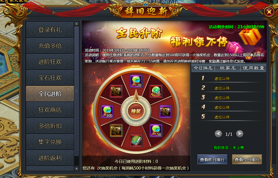 当日每消耗一定数量的进阶石(包含所有进阶石),即可获得一次进阶转盘的抽奖机会,高级进阶装备等你拿!对于消耗数量靠前的玩家,还会获得额外的进阶大礼。
