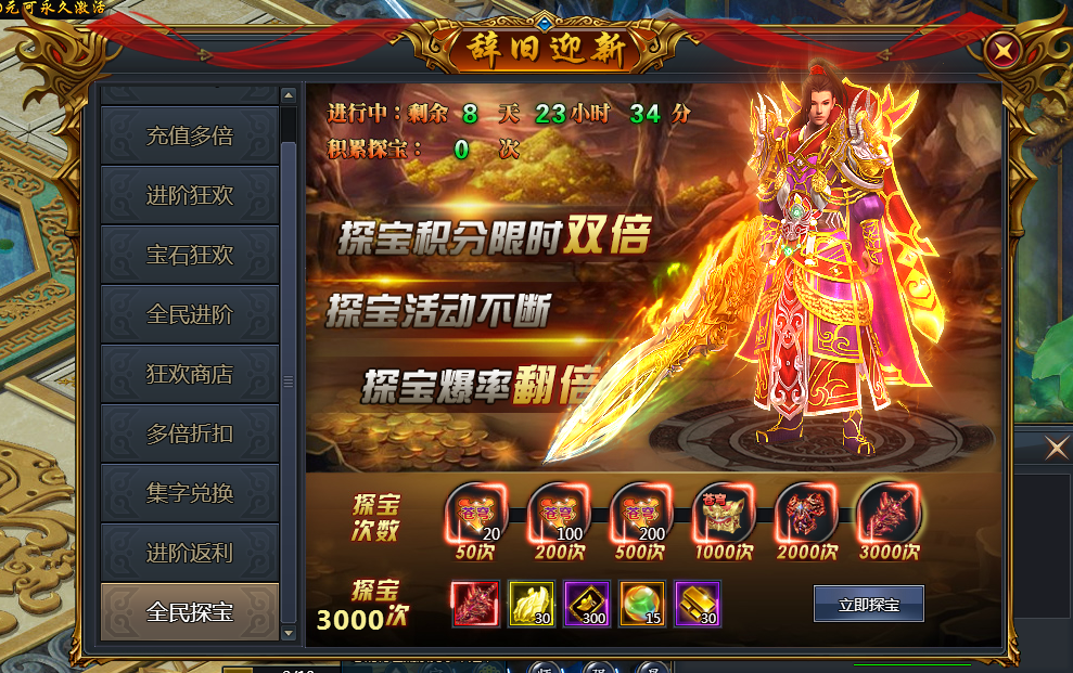 开服15天后的服务器将重新开放全民探宝活动,双倍积分,双倍爆率,极品装备等你来拿。