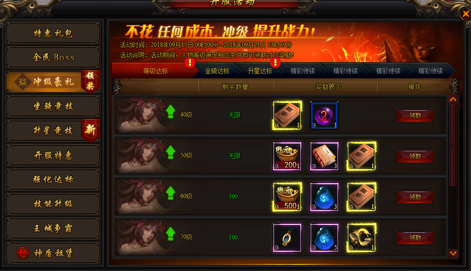 活动说明:活动期间,装备全身强化达到相应等级,即可领取升星石、经验丹、体力丹、无字天书,加油强化吧!