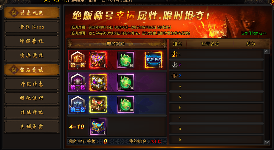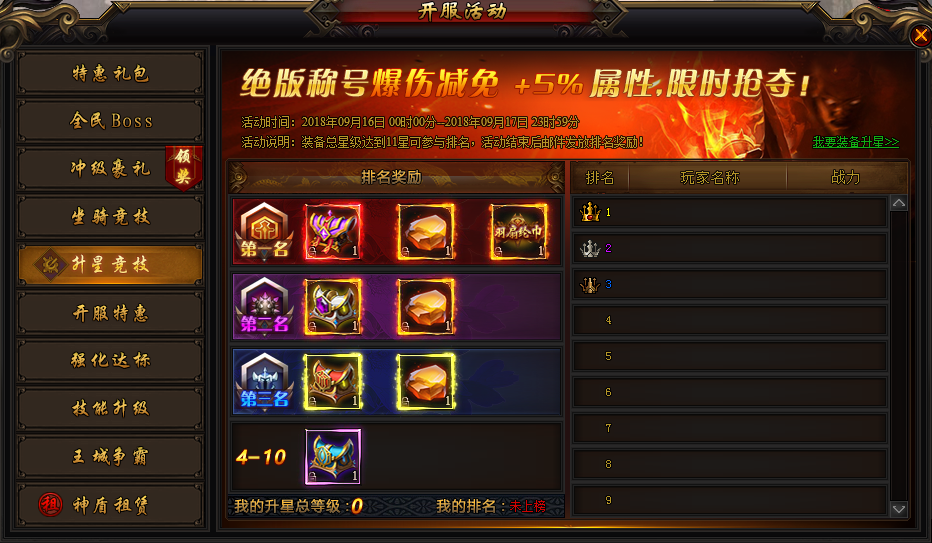 活动说明:装备总星级达到11星可参与排名,排名可获得原石袋,西域精金,称号等。