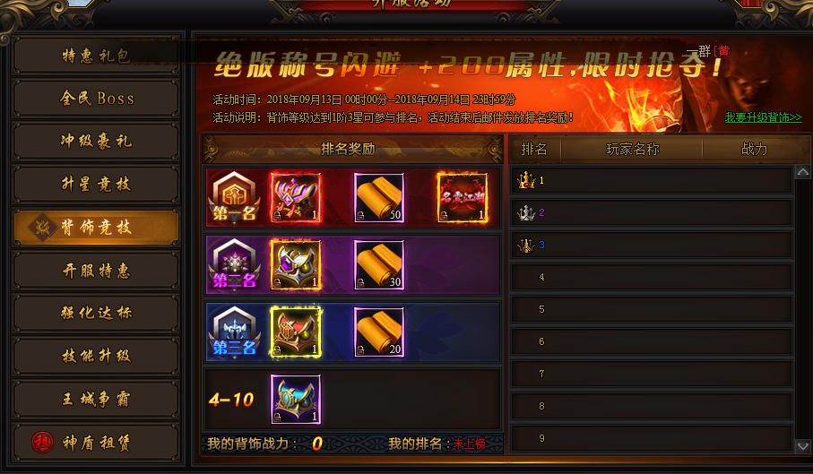 活动说明:背饰达到1阶3星可参与排名,排名可获得丰厚奖励。