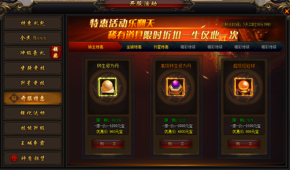活动说明:活动期间所有玩家均可花费少量元宝领取超值特惠礼包,内涵极品装备,海量材料,让你在开服期间升级更迅速,打怪PK更轻松!