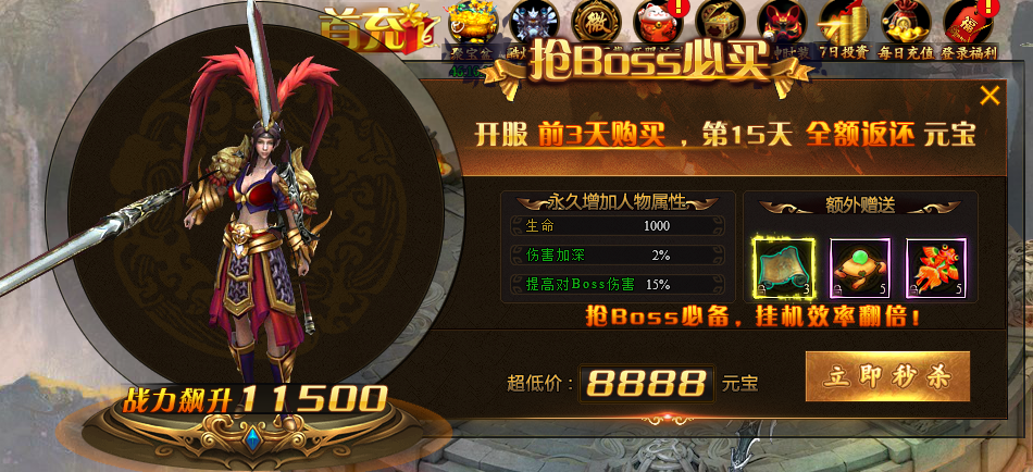 活动说明:活动期间,花费元宝购买成长礼包,一次领取,7天收益。