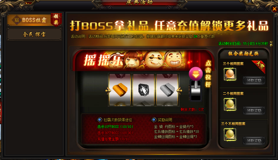 活动说明:活动期间,玩家每天可进行三次拉霸,根据拉霸最终结果来获取奖励,24点重置次数。